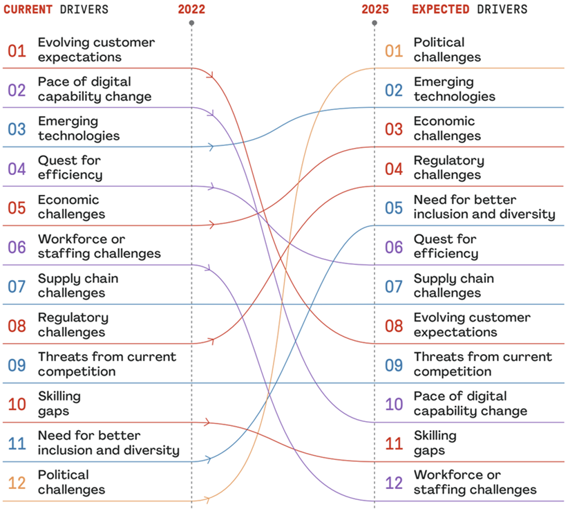 There are many drivers for changing the operating model. Recent research found that the current primary driver, ‘Evolving customer expectations,’ will be replaced by ‘Political challenges’ in 2025. At the time of writing, that’s about 14 months.